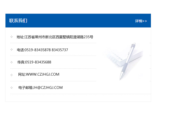 地址:常州市新北區(qū)友邦商務(wù)大廈1幢16、17層  電話:0519-85101652  傳真:0519-85112595  郵編:213022  網(wǎng)址:www.cz-jiayue_cn.sy-zhihuifa.com  郵箱:xiajifengaa@163.com